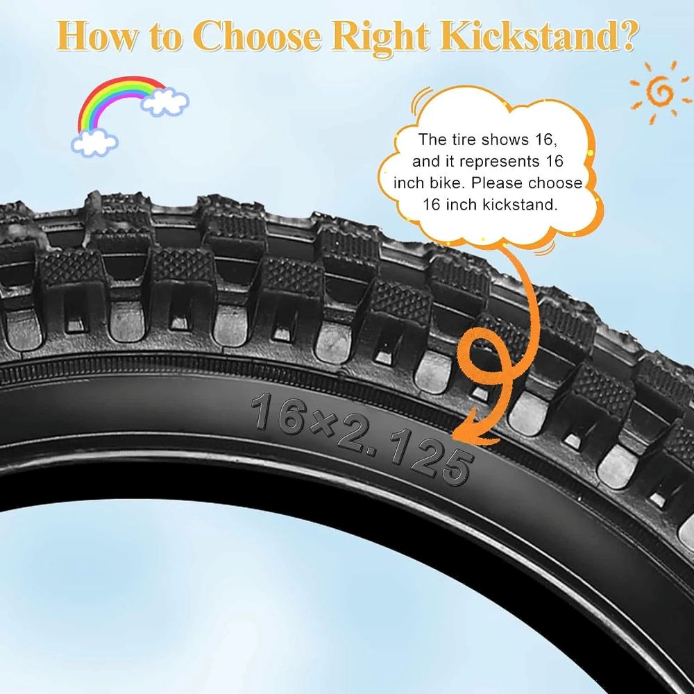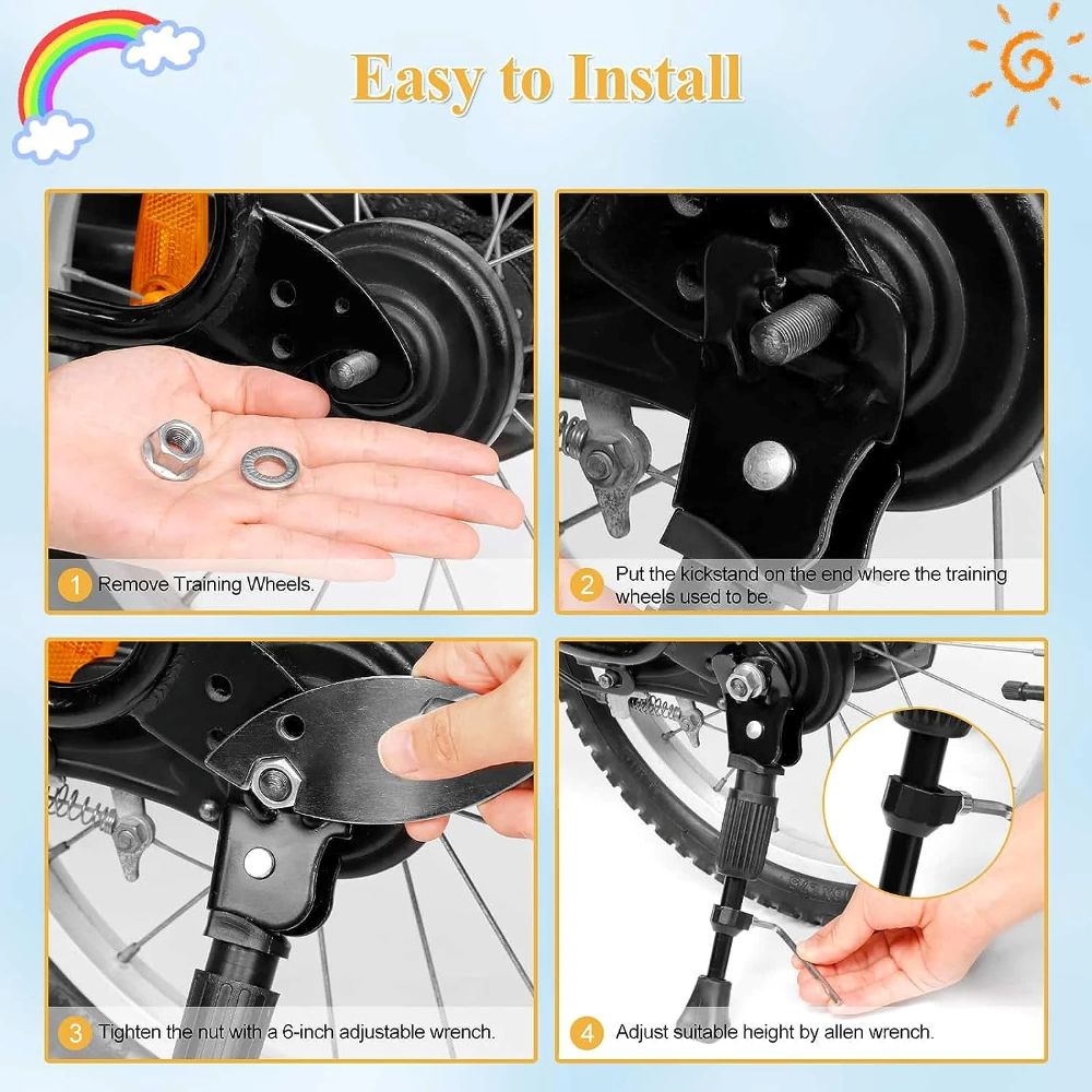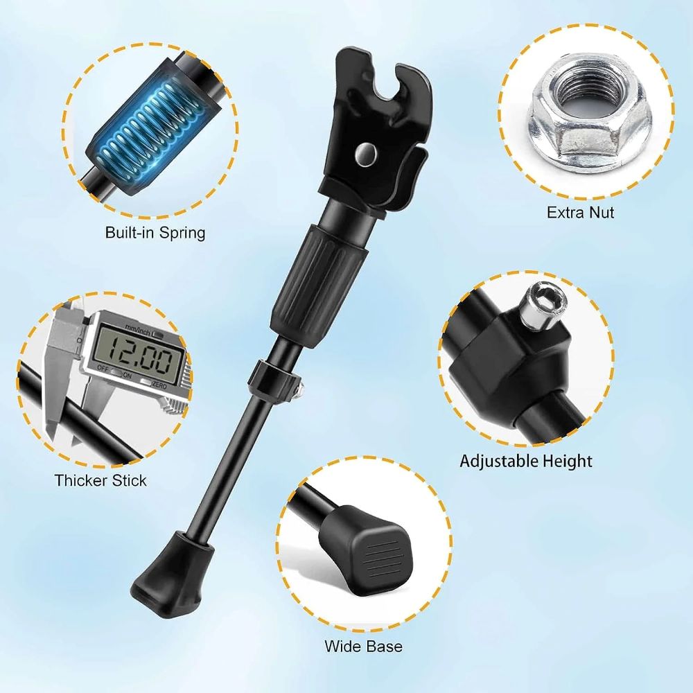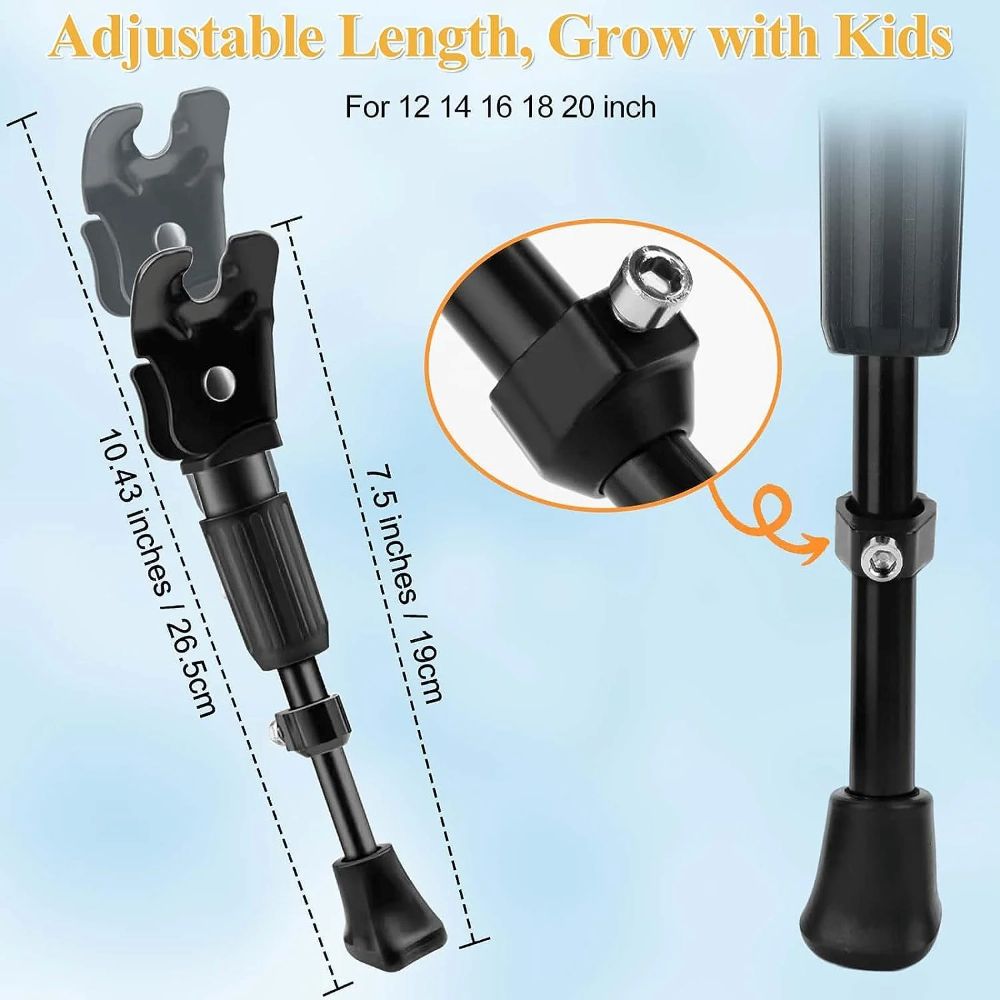 The Kickstand for Bike is a versatile and durable accessory designed to keep your 12″ to 20″ bicycle upright and secure. Crafted from premium carbon steel, this adjustable rear-mount kickstand is weather-resistant, scratch-resistant, and lightweight, making it a reliable choice for bikes. With its built-in spring and wide base, it provides a safer and more stable parking solution, allowing your to easily put the kickstand up and down without assistance. The adjustable length ensures the kickstand can grow with your, accommodating their bike size as they progress. Whether in the room, garage, or outdoor setting, this kickstand is a practical and reliable addition to your cycling experience.