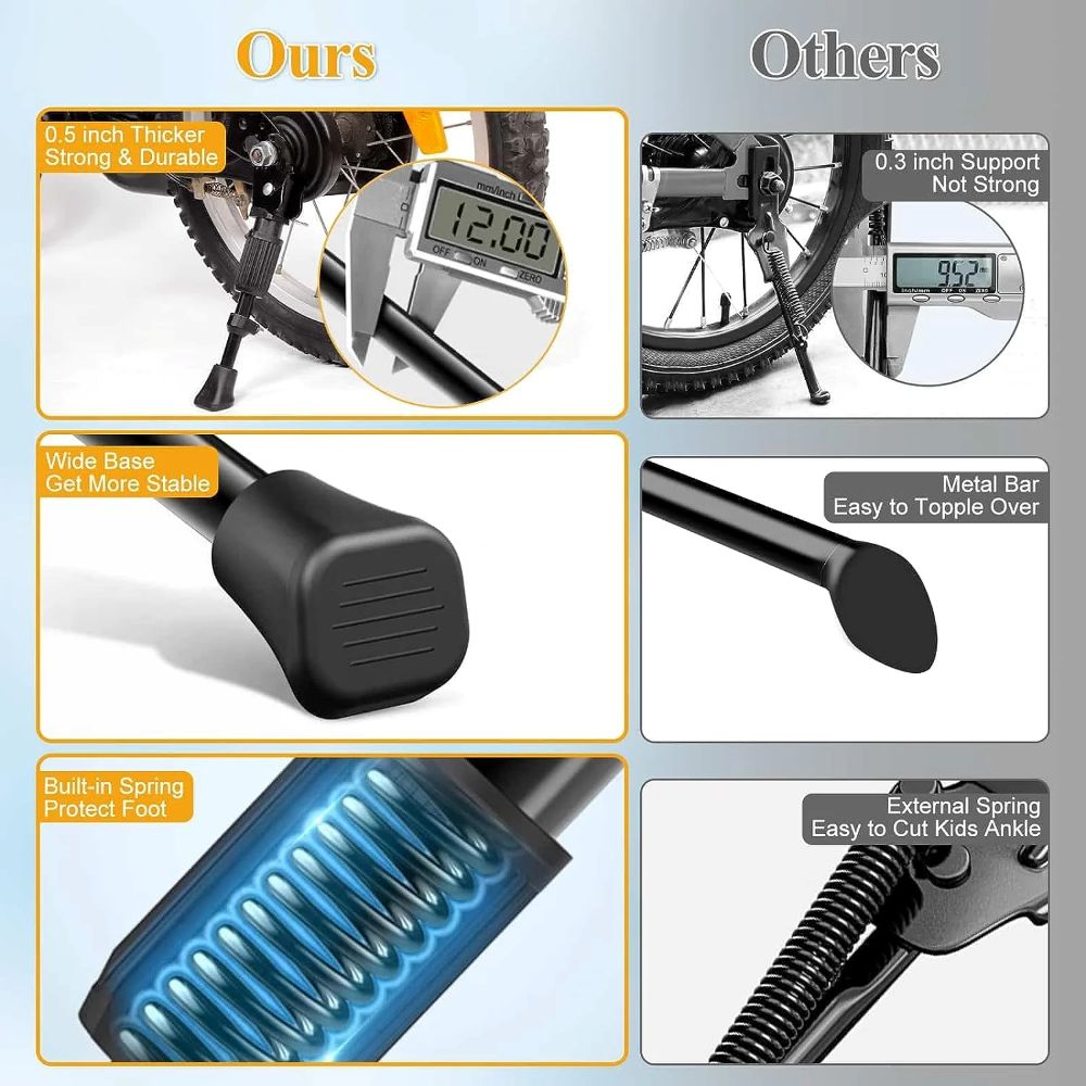 - For Bikes With 12″ – 20″ Wheel: This bike kickstand is used for most 12″ 14″ 16″ 18″ 20″ mountain bikes, road bicycles, BMX/MTB, and adult bikes. The bike kickstand is made of premium carbon steel, which provides durable and firm support for the bicycle