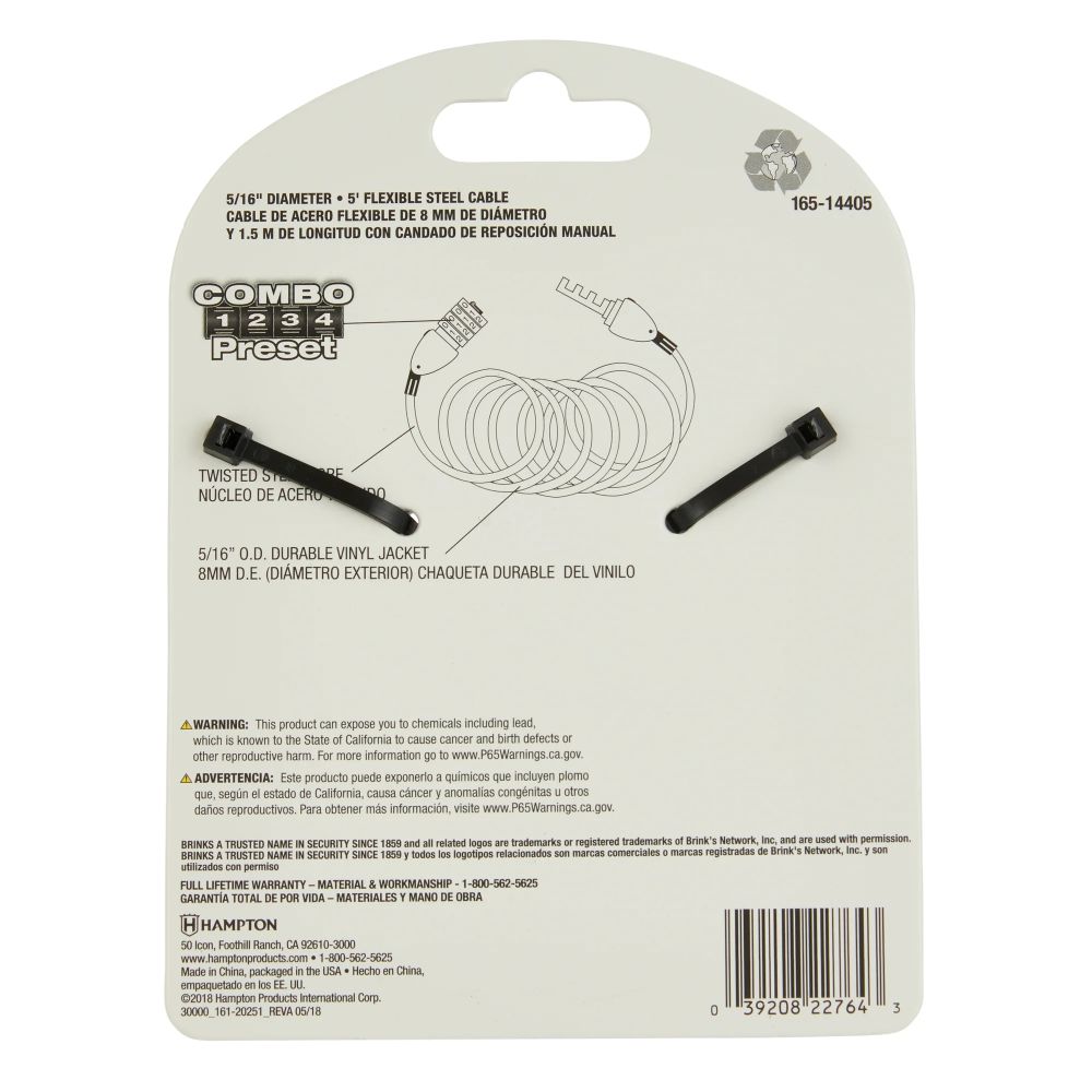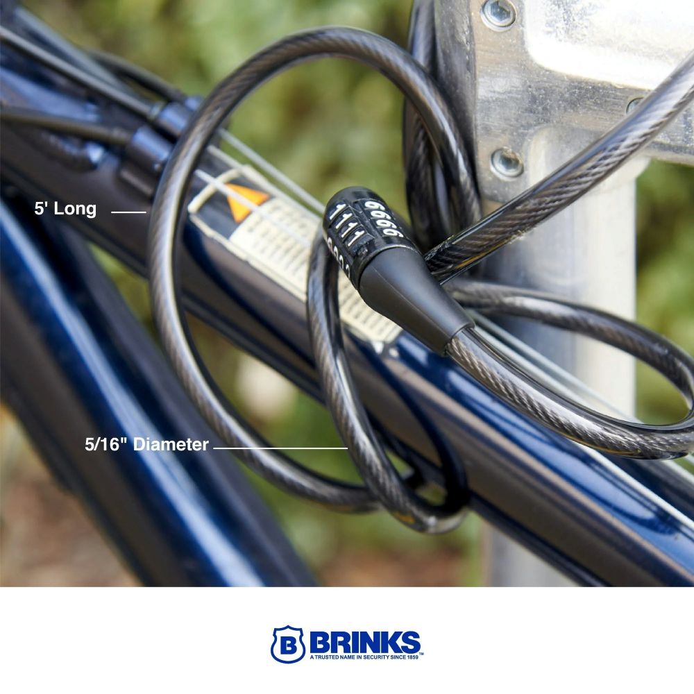 The Brink’s cable lock is designed with twisted flexible steel for maximum strength and cut resistance. The cable comes with a four-digit preset combination lock. The lock is easy to use and set, allowing for keyless convenience. The jacket reduces the scuffing of your items. The cable is compact and self-coils for easy use and storage. It is ideal for bicycles, sports equipment, gates, fences, toolboxes, sheds, storage containers, outdoor furniture, grills, and more. ”A Trusted Name in Security since 1859.”
