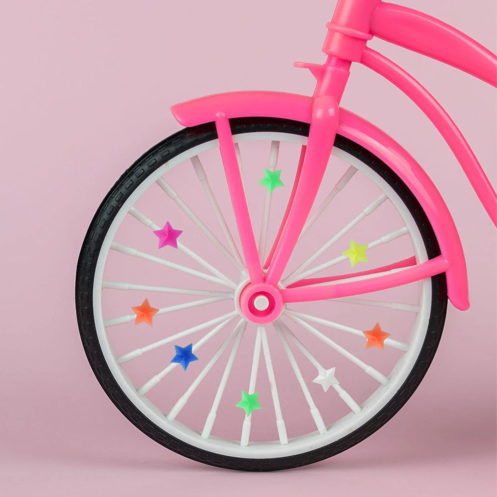 Add some personal flair to your bicycle with vibrant decorations for bike tires. Multi-colored, ball and star decorations easily snap onto wheel spokes, adding a bright spectrum of colors that will brighten her day.