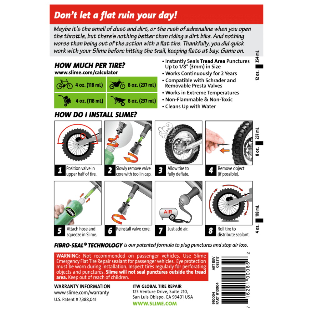 No more flats! Slime Tube Sealant seeks out and instantly seals punctures in your tubes up to 1/8″ (3mm). When a puncture occurs, our patented sealant is carried directly to the puncture. The pressure of the escaping air forces the particles into the opening, where they build up and intertwine to form a long-lasting, flexible plug. Instantly, air loss is blocked and a flat tire is prevented. Install in your bicycles, dirt bikes, wheelbarrows, riding mowers and more, and enjoy two years of continuous flat tire protection. Gel Adhesive form